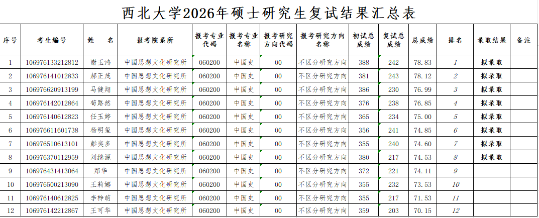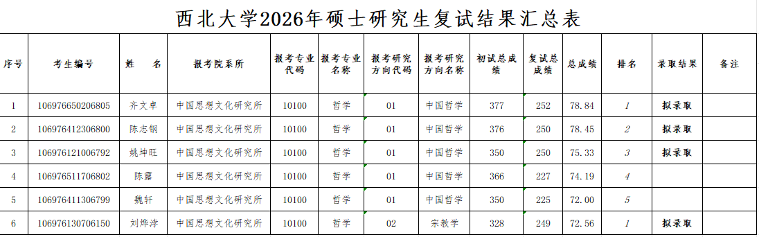 思想所2026年硕士研究生复试结果公示